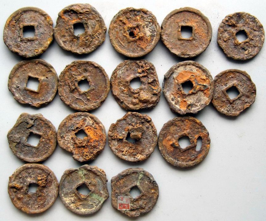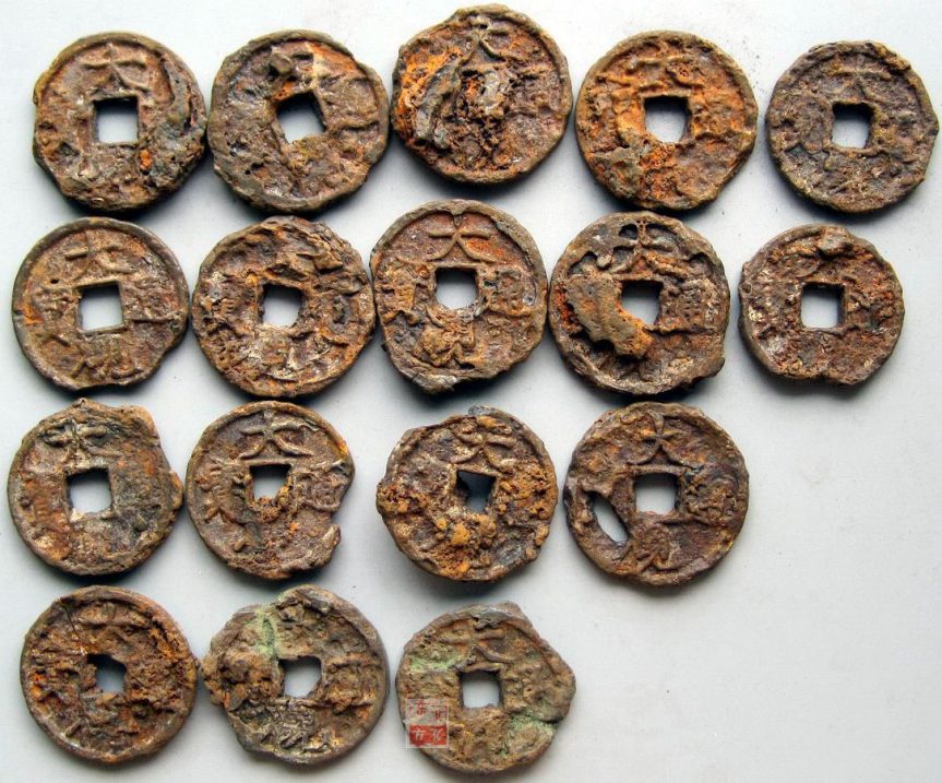 K8838, Da-Guan Tong-Bao, Large 3-Cash Coins, 17 Pcs Iron, China AD 1107-1110.