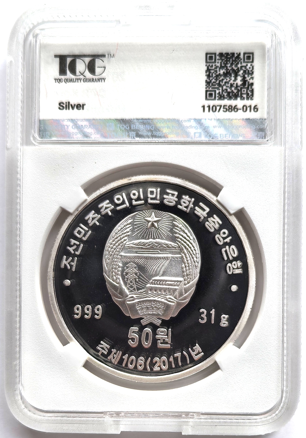 Issued by Korea in 2017. The face value is 50 Won. One ounce silver, 31 grams. The picture is “Pukguksong-2 Missile Rocket”. The missile was launched on Feb 12, 2017. The mintage is only 500 Pcs.