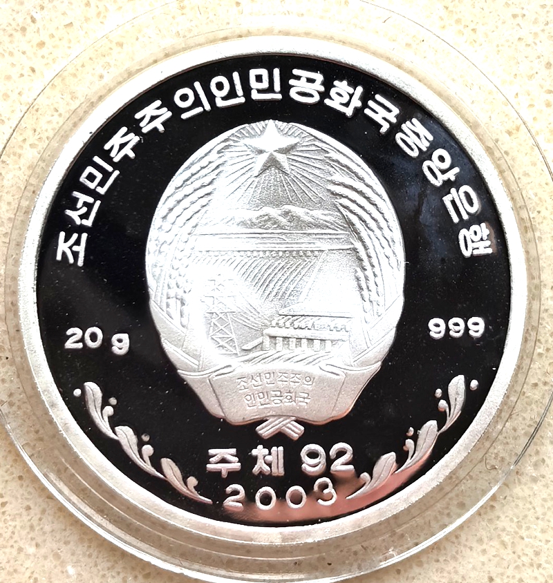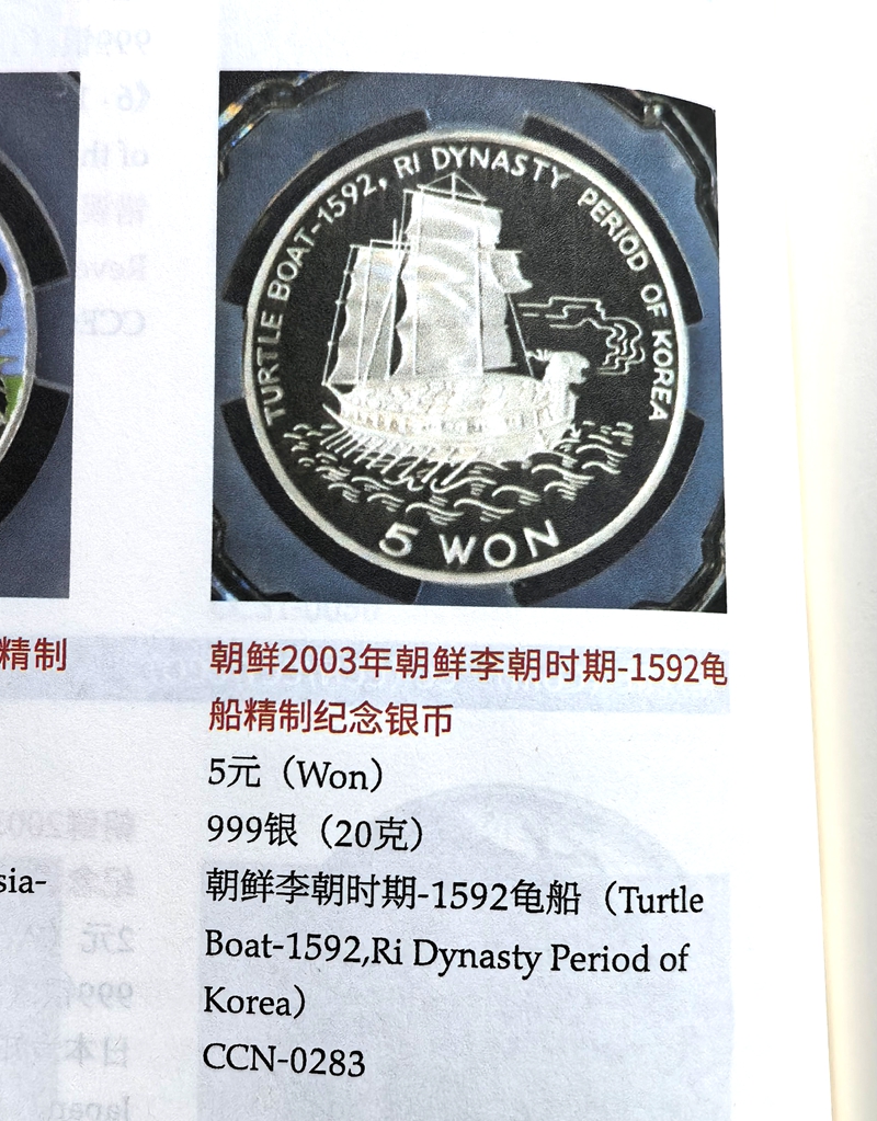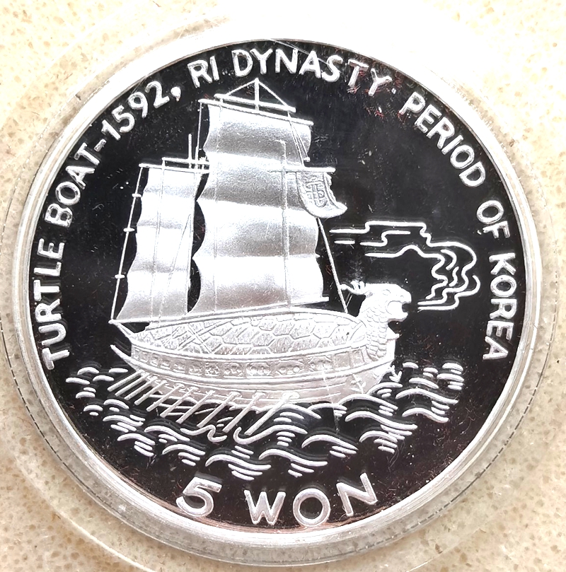 Issued in 2003, “Trutle Boat, 1592, Ri Dynasty”. The face value of the Silver coin is 5 Won. 20 Grams silver.