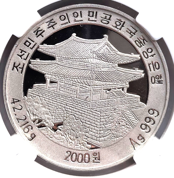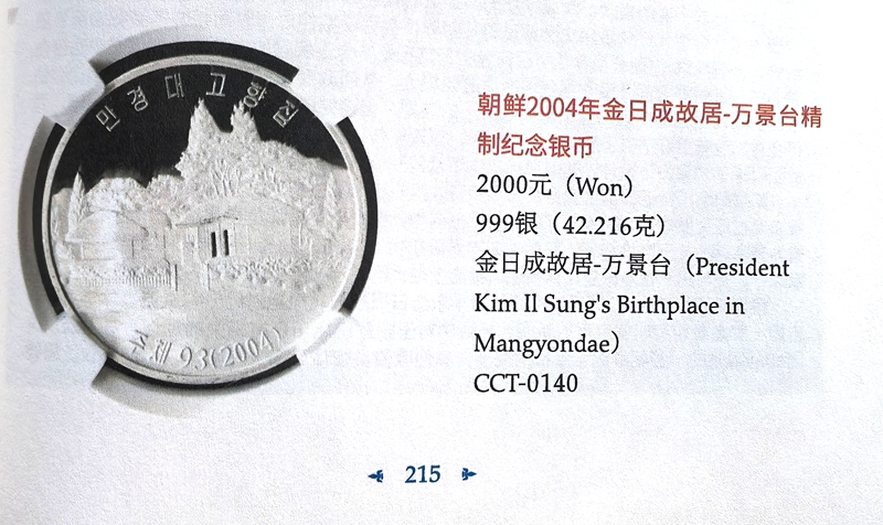 Issued by Korea in 2004. The face value is 2000 Wons for each coin. The picture is “Kim Il Sung’s Birthplace in Mangyondae”.