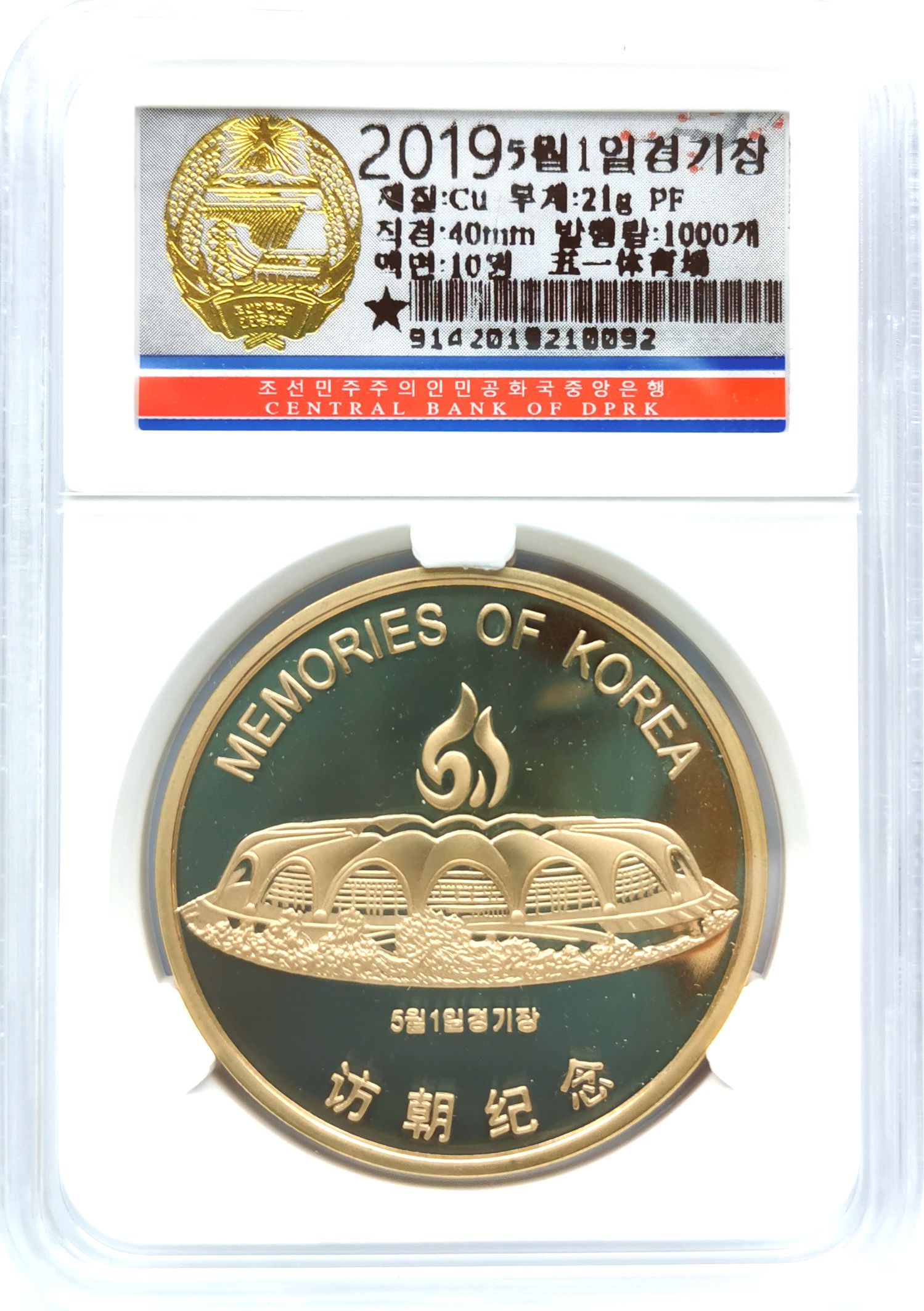 Issued by Korean in 2019, “Visiting Korea Proof Coin Series — May 1 Stadium”. The face value of the Brass coin is 10 Won. Size: 40 mm in diameter.