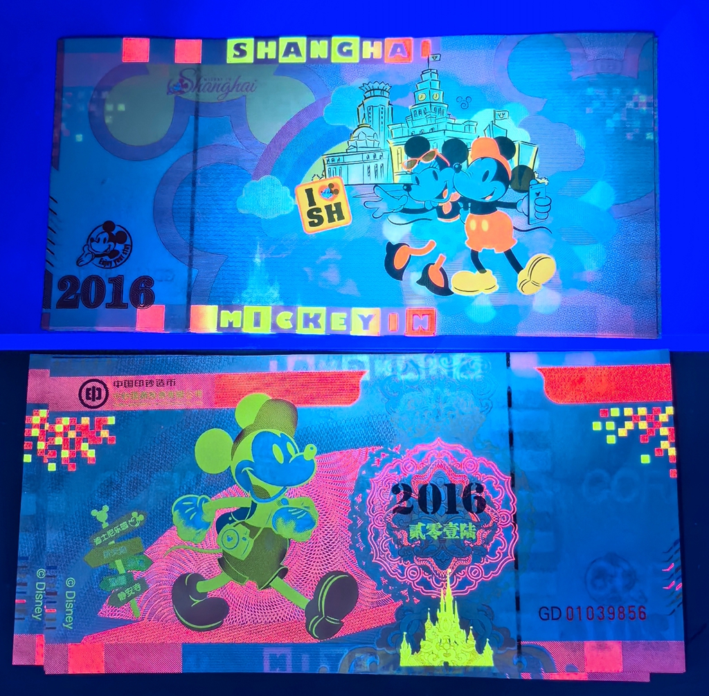 UNC, 1 pcs Disney paper money issued by Shanghai Disneyland. Printed by China Banknote company. The second picture is UV light photo.