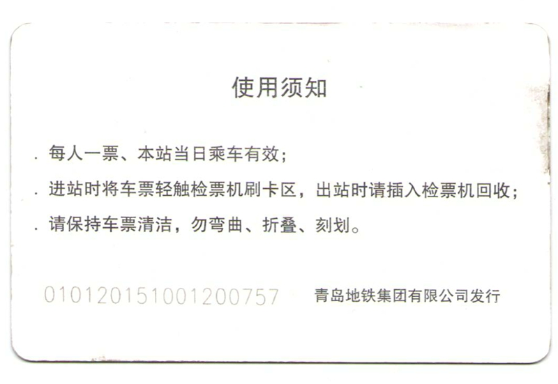 T5272, China Qingdao City, Metro Card (Subway Ticket), One Way 2022